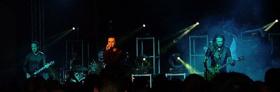 Als sich kurz nach 19 Uhr die Tore der Matrix für alle Besucher öffneten, strömten diese fluchtartig die vielen Treppen hinab bis in den letzten Raum vor, um einen der heiß begehrten 1.Reihe-Plätze zu ergattern. Unsereiner ließ sich etwas mehr Ruhe und fand dennoch ein lauschiges Pl�tzchen, welches in der 5.Reihe, direkt an der linken Bar war *hehe*. Es dauerte nicht lange und der Support des Abends „Tr�mmerwelten“ kam auf die Bühne und versuchte dem Publikum einzuheizen. Doch die Bochumer sind da anscheinend etwas eigen, denn die „Trümmerwelten“ hatten es wahrlich schwer. Auf deren Fragen hin, ob wir mehr hören wollen würden, reagierte kaum einer im Raum, wohingegen nach der Frage „sollen wir aufhören zu spielen“ ein reges Gemurmel durch den Saal ging ... so was hatte ich auch noch nicht erlebt, aber nun gut. Sie absolvierten dennoch souverän Ihre Show und begeisterten zum Ende hin doch noch den ein oder anderen Fan, so dass sie doch mit gräßerem Applaus dankend verabschiedet wurden.